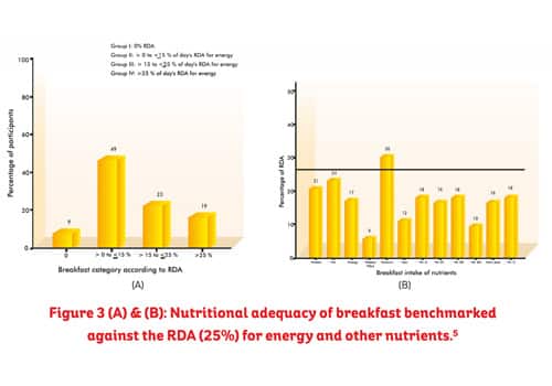 The nutritional adequacy of the breakfast meal vis-à-vis the recommended dietary allowances (RDA) for energy and other nutrients was also evaluated in the same study. The findings reported suboptimal intakes of fibre and certain vitamins and minerals. Also intake of only calcium was found to be high (30% of daily RDA) possibly due to consumption of milk at breakfast (Figure 3B).5