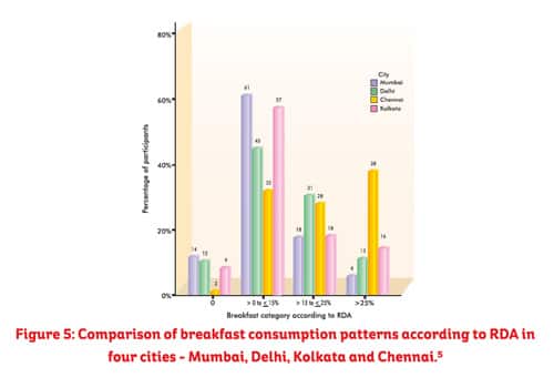 Figure 4 illustrates breakfast inadequacies of nutrients like iron, fibre and certain B complex vitamins were not being compensated by the day’s intake of food through other meals across all age groups studied. Also intake of nutrients at breakfast plus midmorning meal was unable to meet 25% of the RDA for all nutrients, thereby highlighting the utmost importance of the first meal of the day.5