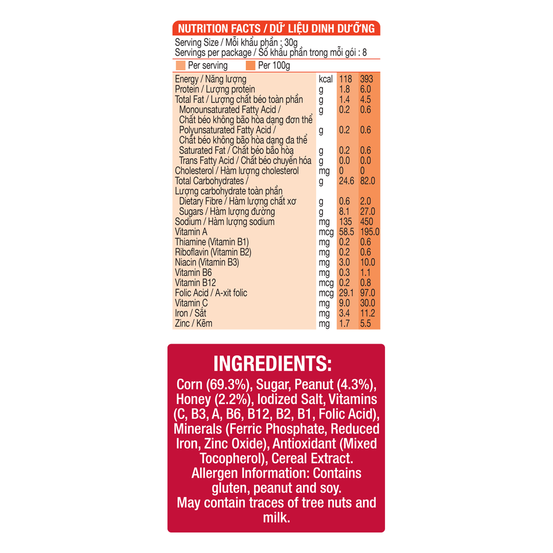 Jagung (69.3%), gula, kacang tanah (4.3%), madu (2.2%), garam, premiks vitamin dan mineral (vitamin C (asam askorbat, B3 (niasin), A, B6 (piridoksin), B12 (sianokobalamin), B2 (riboflavin), B1 (tiamin), B9 (asam folat)), mineral zat besi dan seng, antioksidan tokoferol, ekstrak sereal (0.01%)