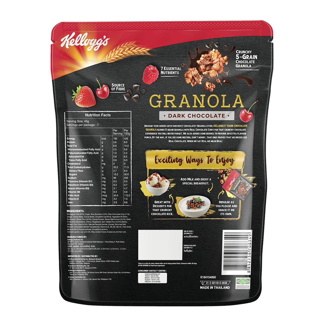 Indulge your senses with our most chocolatey granola ever. Kellogg's® Dark Chocolate Granola blends 5-grain granola with real chocolate chips made with Belgian chocolate for that crunchy chocolate experience you will never forget. We also added some berries to provide an extra flavour punch. By the way, if you see some melting, don't worry, that only proves that we indeed use real chocolate. When we say real, we mean real!